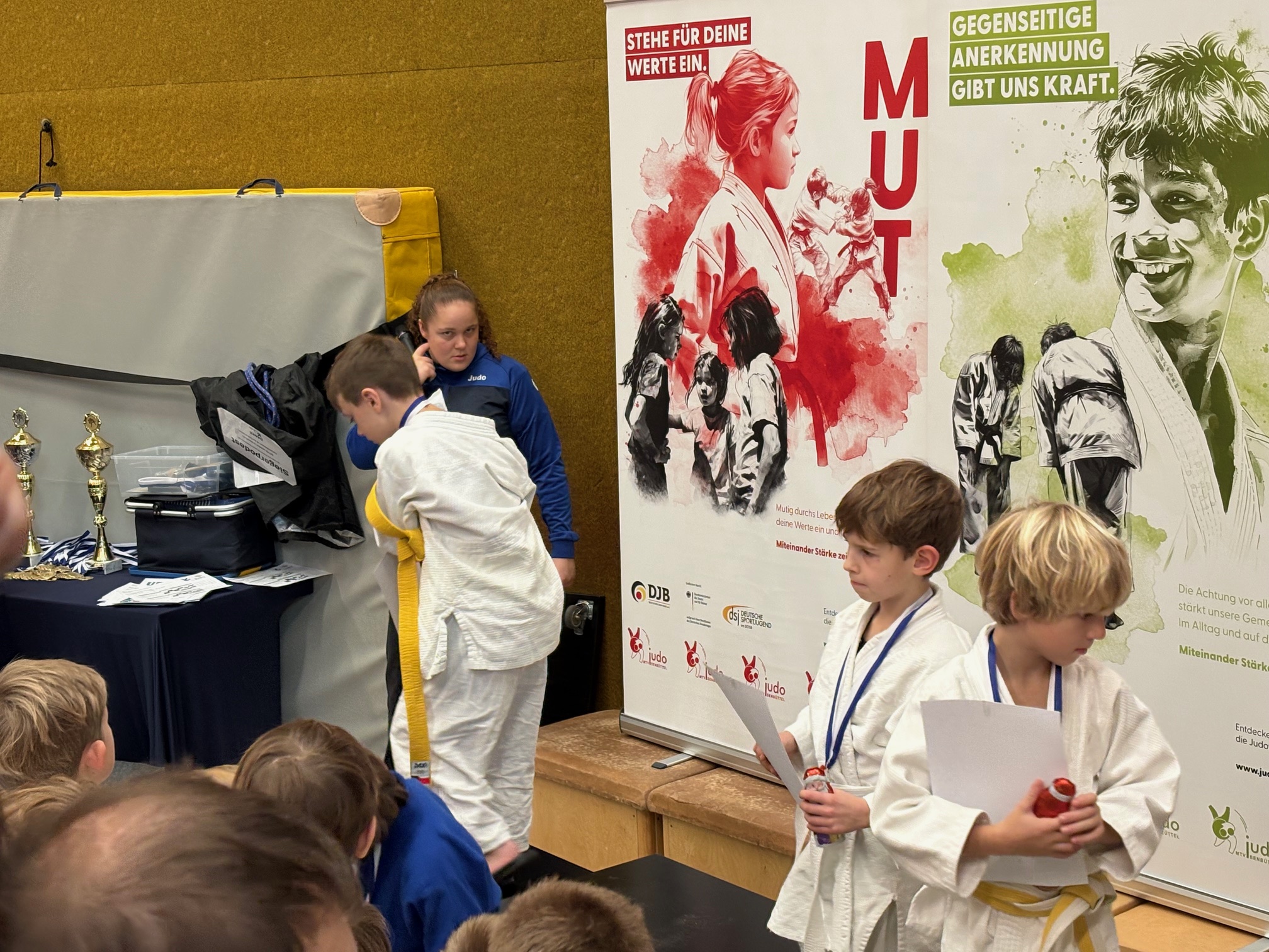 Die Teilnehmerzahl war auf 200 Kinder begrenzt – und der SV Groß Oesingen und HSV Hankensbüttel waren dabei. Wie schön ist es doch, beim Aufwärmen mit dem Trainer Fabian auf der Judomatte herumzutollen. Doch dann heißt es: Aufstellung! Die kleinen Judokas sind gewogen, in gleichmäßige Gruppen aufgeteilt und der erste Kampf steht bevor.